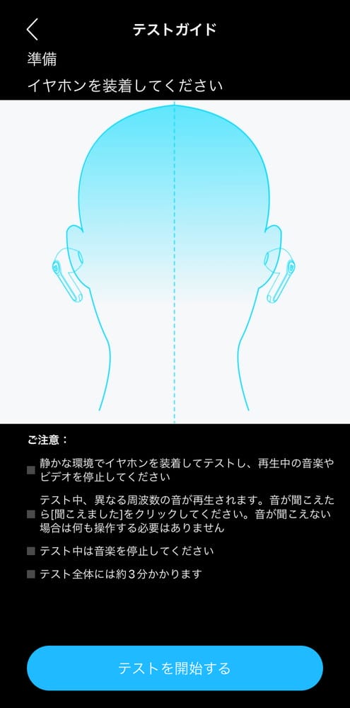 まずペアリング済みのイヤホンをケースから取り出し、両耳にはめる。カナル型のため、イヤホン先端が耳奥まで到達するよう、耳にシッカリと装着する。