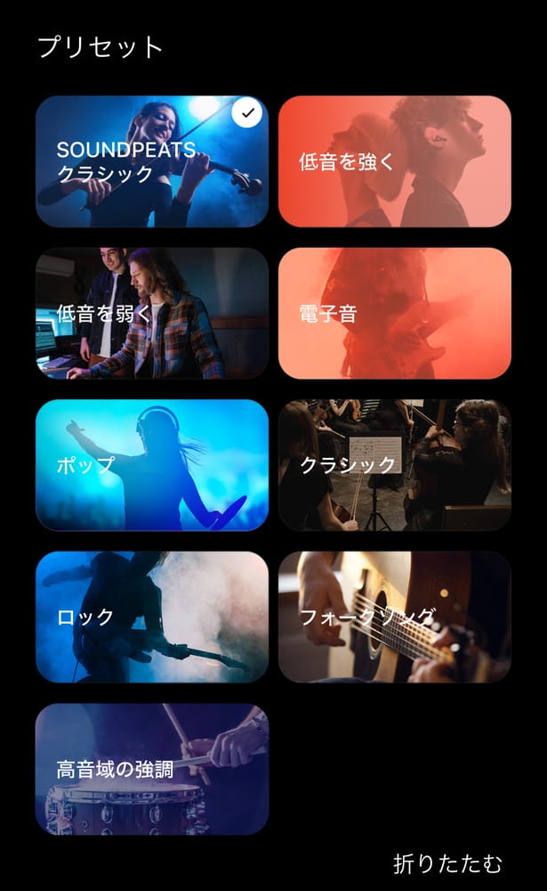 また、イコライザーを細かく調節するのが面倒な方向けに、複数のEQプリセットも用意されている。