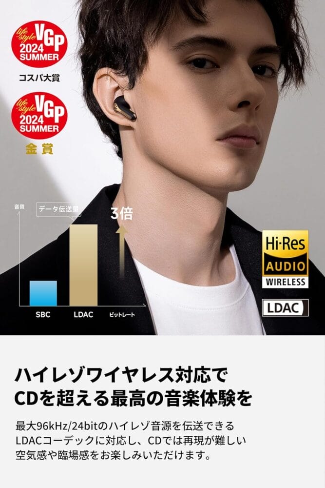 Bluetooth接続対応のワイヤレスイヤホンであり、ハイレゾワイヤレス認証を取得。20Hz~40kHz(従来のコーデックは20Hz~20kHz)という広い再生帯域をカバーすることで、ボーカルや楽器の音を繊細に描き出すことができる。