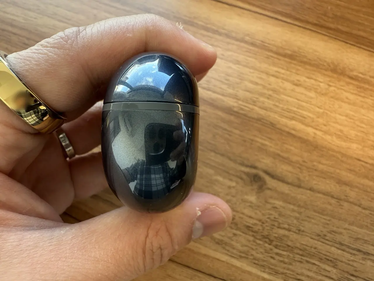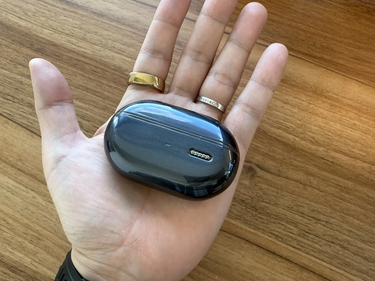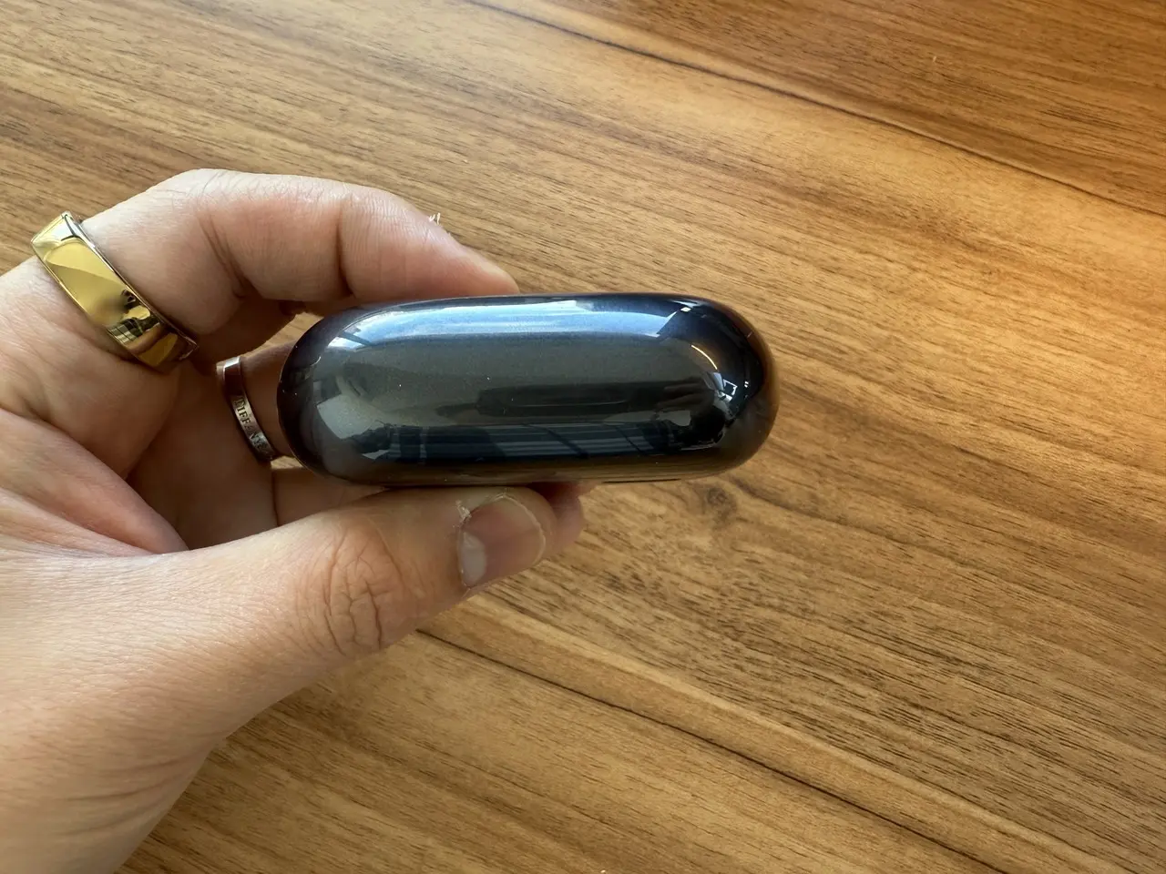 ▼チャージケースの外観。72.21×24.15×45.53mmの楕円形デザイン。