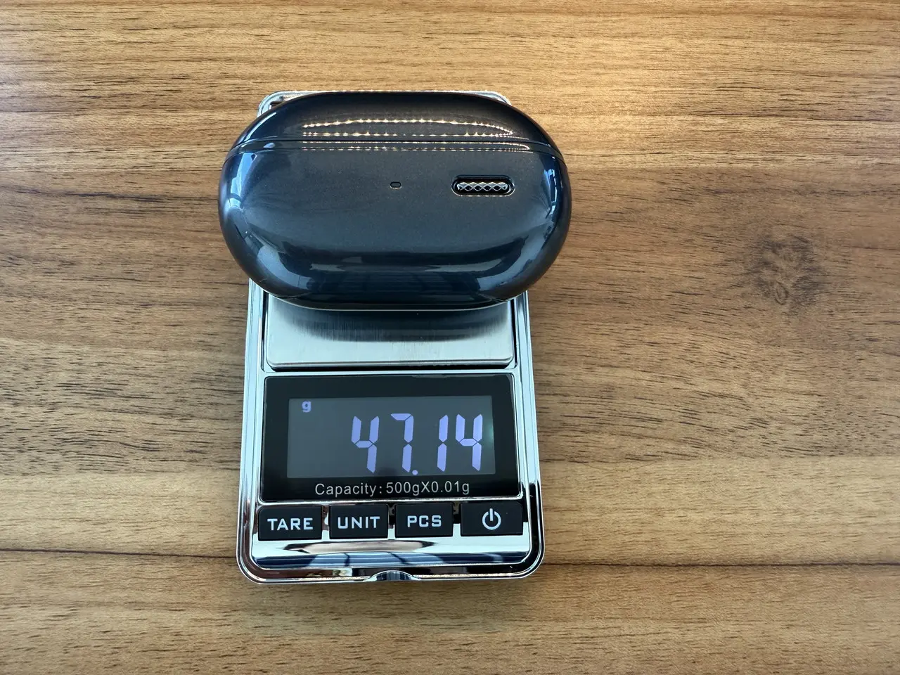 ▼イヤホンを格納した状態のケース重量は、実測で約47.14g。