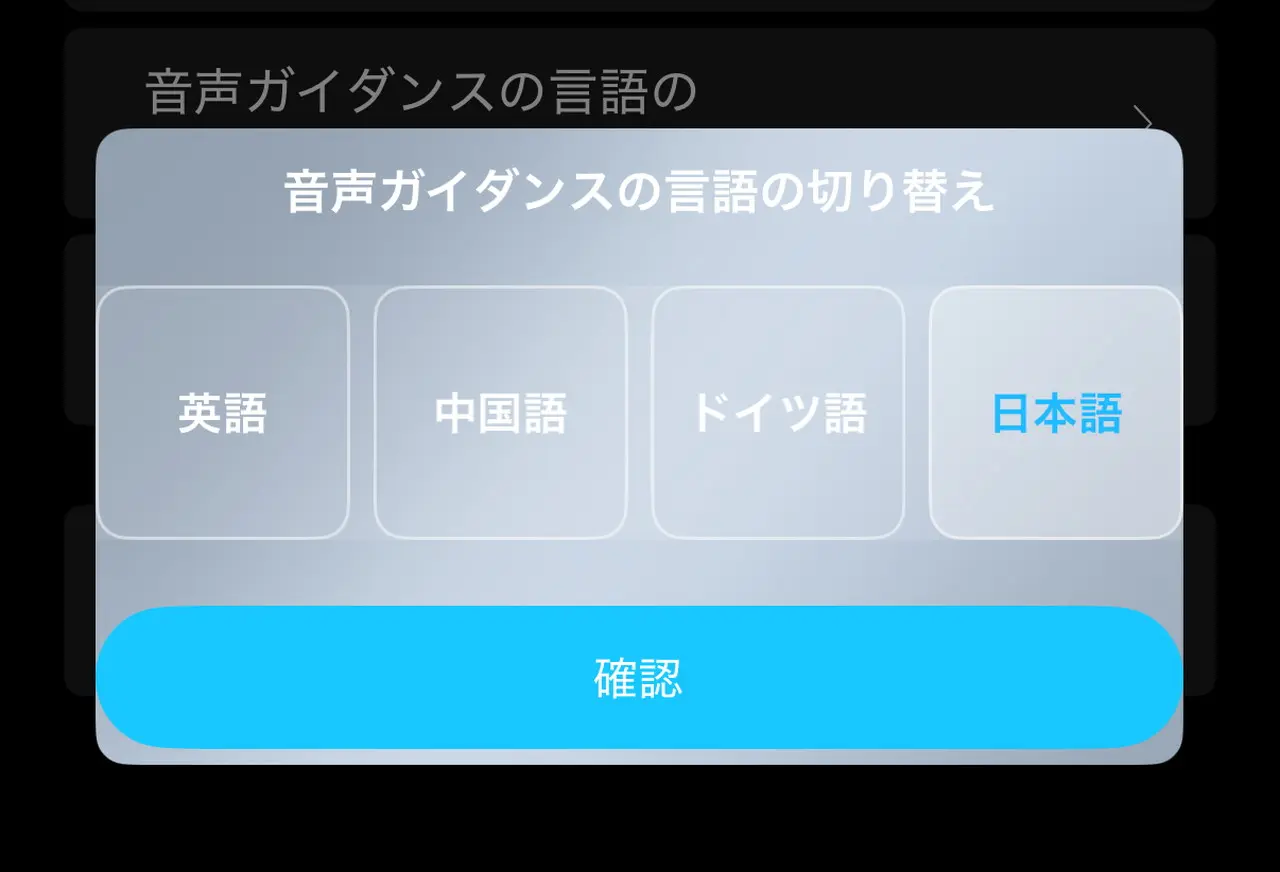 ▼音声ガイダンスの言語はデフォルトで英語に設定されているが、日本語に変更可能。