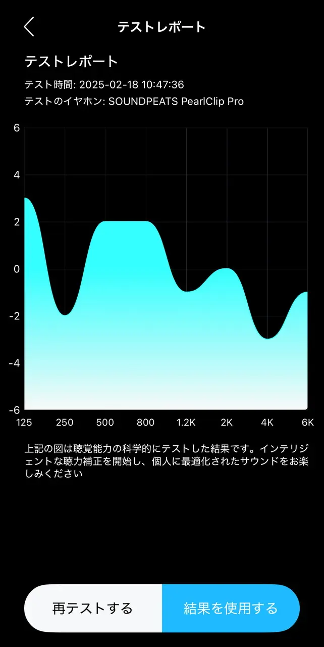 特定の周波数のテストトーンやホワイトノイズをイヤホンから再生していき、テスト終了後にテストレポートを生成。その結果に基づいたイコライザー設定を反映できる。
