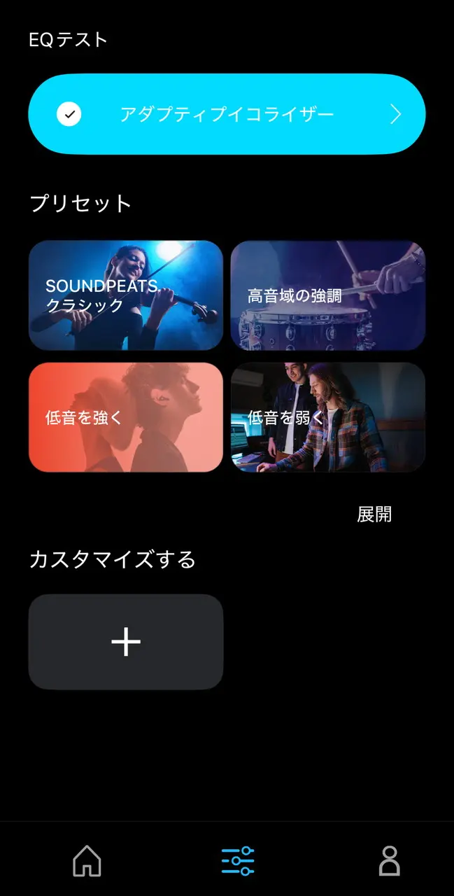 そして「アダプティブイコライザー」機能も用意されている。これは、ユーザーの聴覚特性や装着状態に応じて音質を最適化するテスト機能だ。