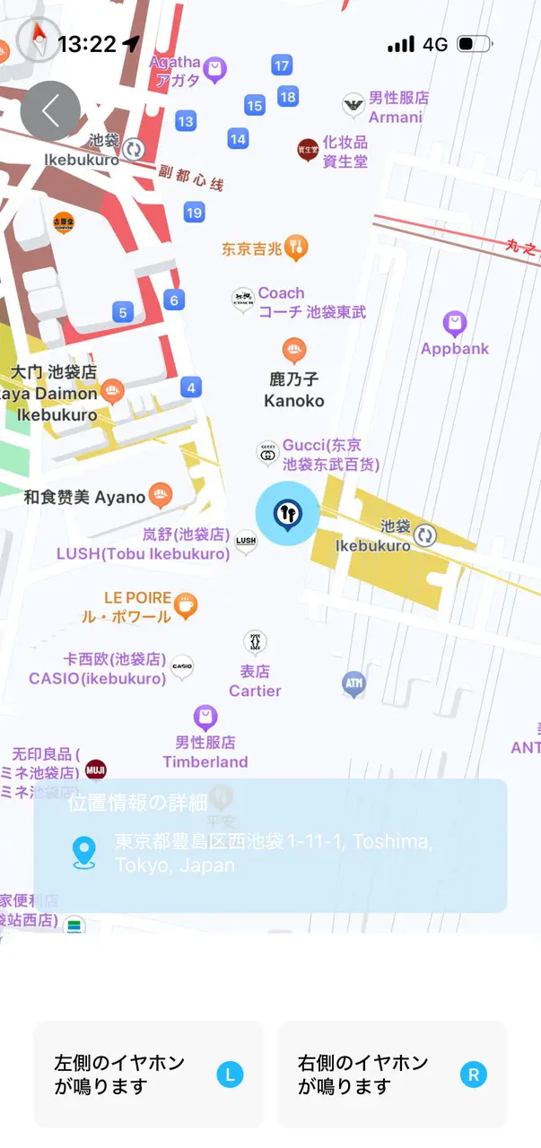 アプリ上で「イヤホンを探す」画面を起動すると、接続中のイヤホンの位置がマップ上に表示される。