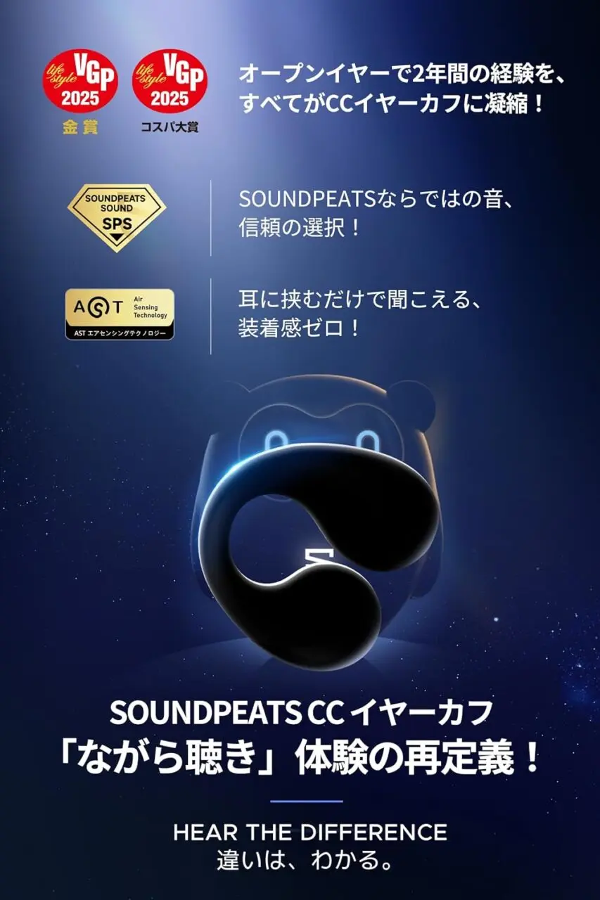2024年10月、無線型のイヤホンを数多く手掛けるSoundPEATS(サウンドピーツ)は、オープンイヤー型の完全ワイヤレスイヤホン『SOUNDPEATS CCイヤーカフイヤホン』を販売している。