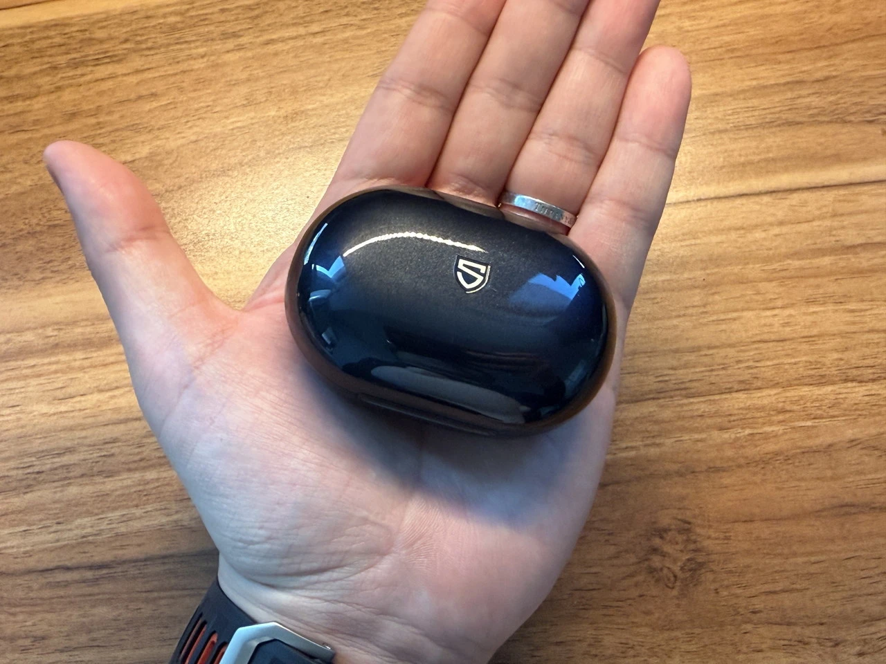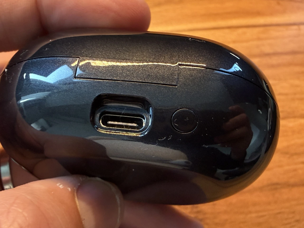充電ケースは手のひらに収まるほどのコンパクトサイズ。指紋や皮脂汚れが若干目立つのがネック。