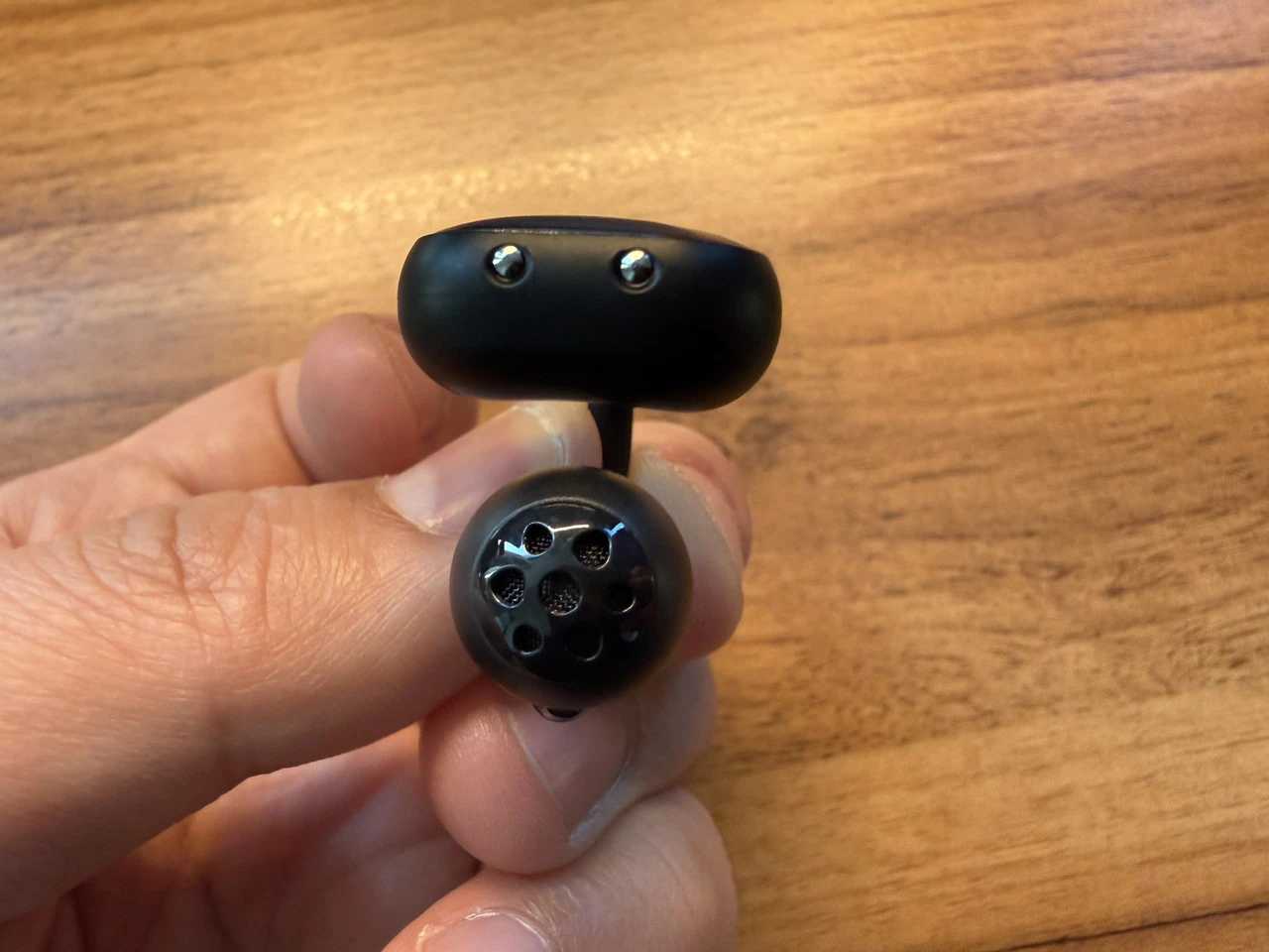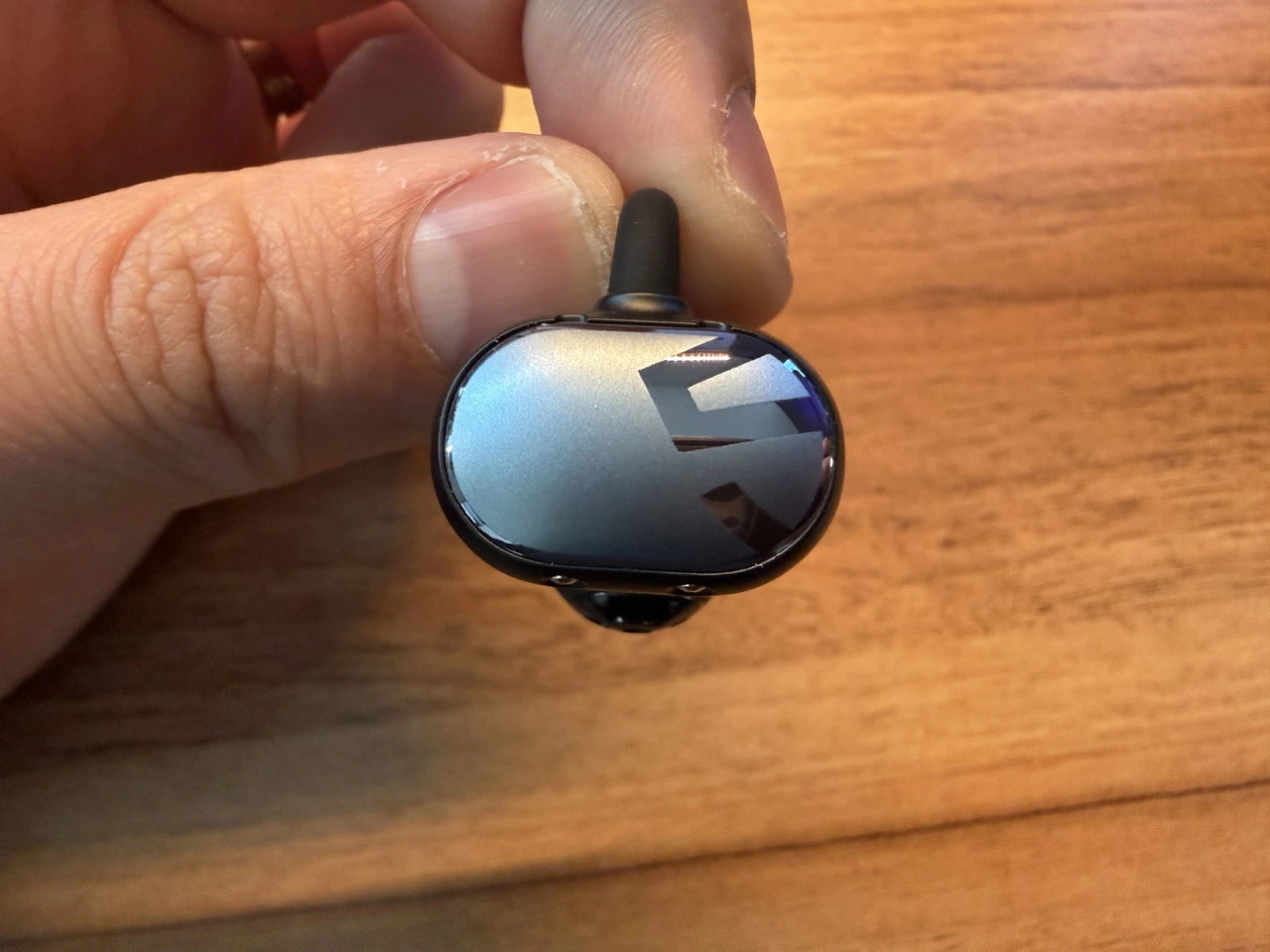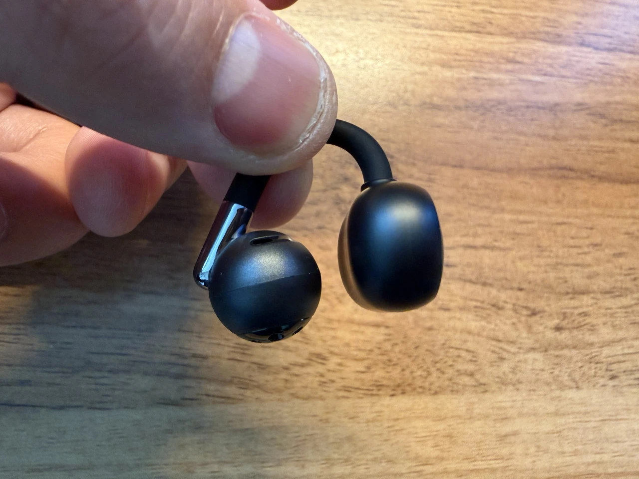 イヤホンのフォルム自体は、最近流行りのイヤーカフ型と大差ありませんが、スピーカー搭載部がやや大きめに設計されている印象です。