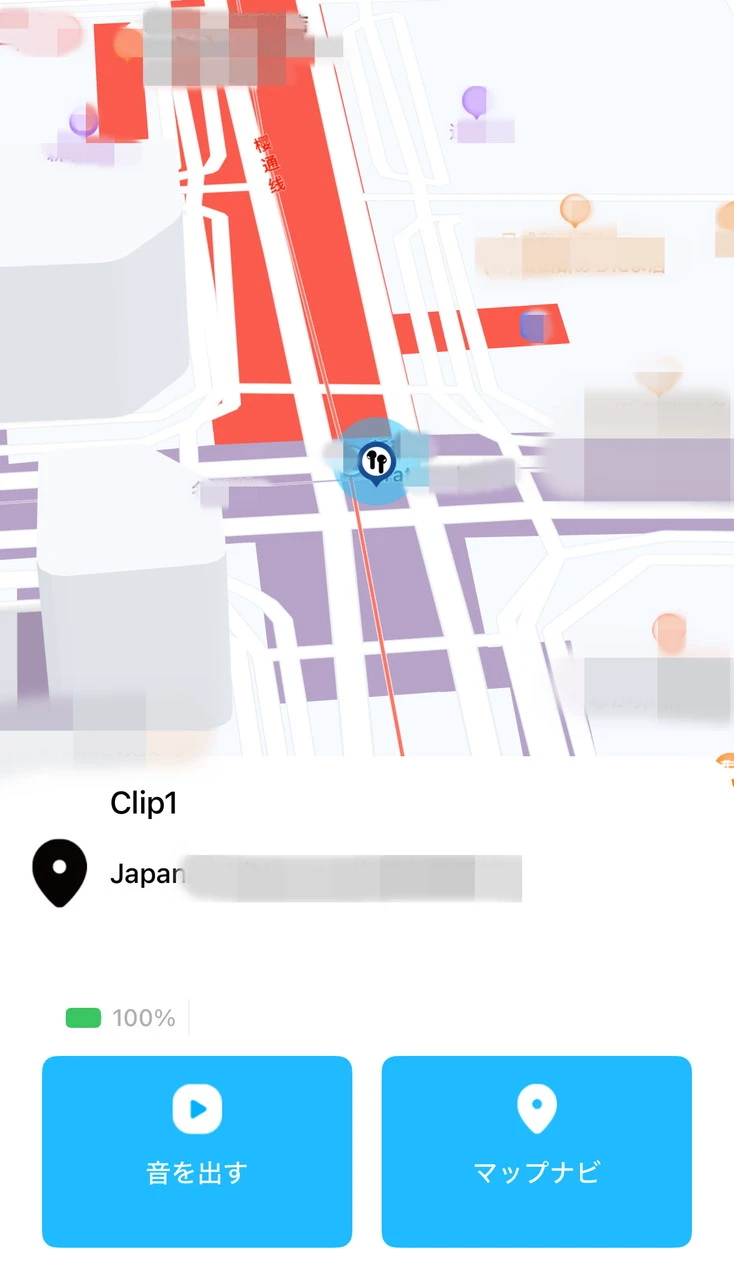 そして「イヤホンを探す」機能も用意。マップ上にイヤホンの位置が表示されるほか、イヤホン本体から大きな音を発生させて位置を特定することができます。イヤホンがどこに行ったのか分からない場合に、見つけ出すのに便利です。