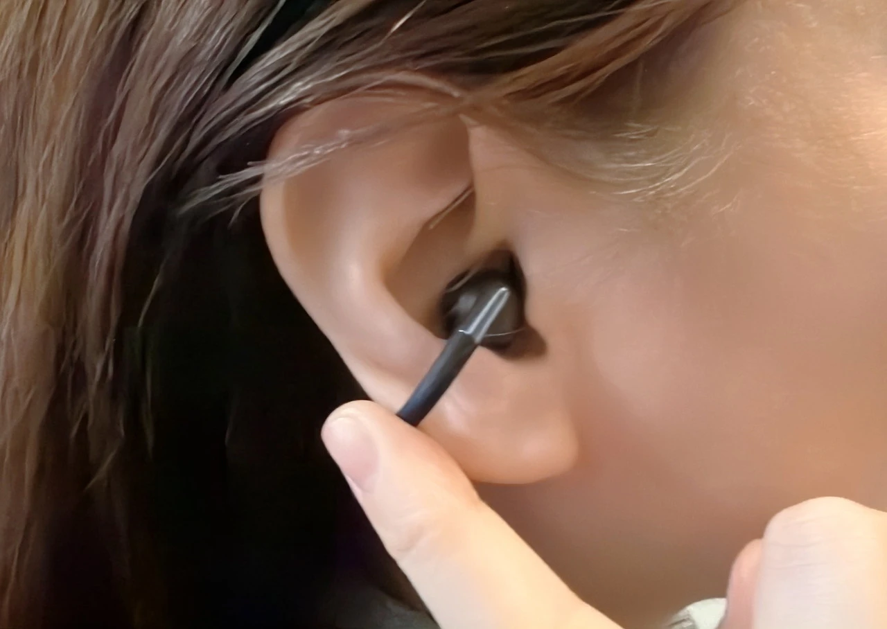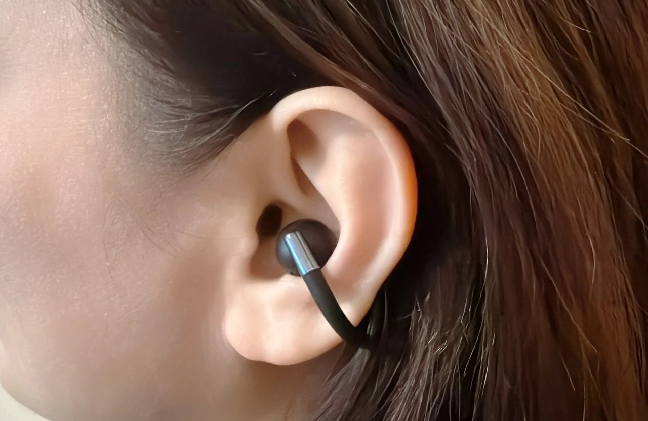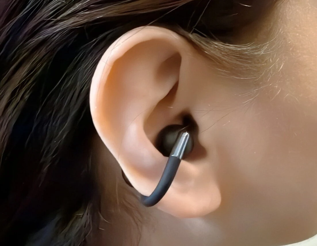 本機を実際に装着してみると、まず感じるのは耳への負担が少なく、長時間着けていても痛みや圧迫感がない点です。 形状記憶合金ならではのしなやかな弾性、そして軽量設計(片耳5.41g)のおかげで、運動中や移動時でも違和感なく自然に装着できます。