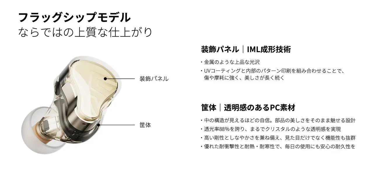 ▼イヤホン本体の外観。中の構造が見えるスケルトンデザインを採用。