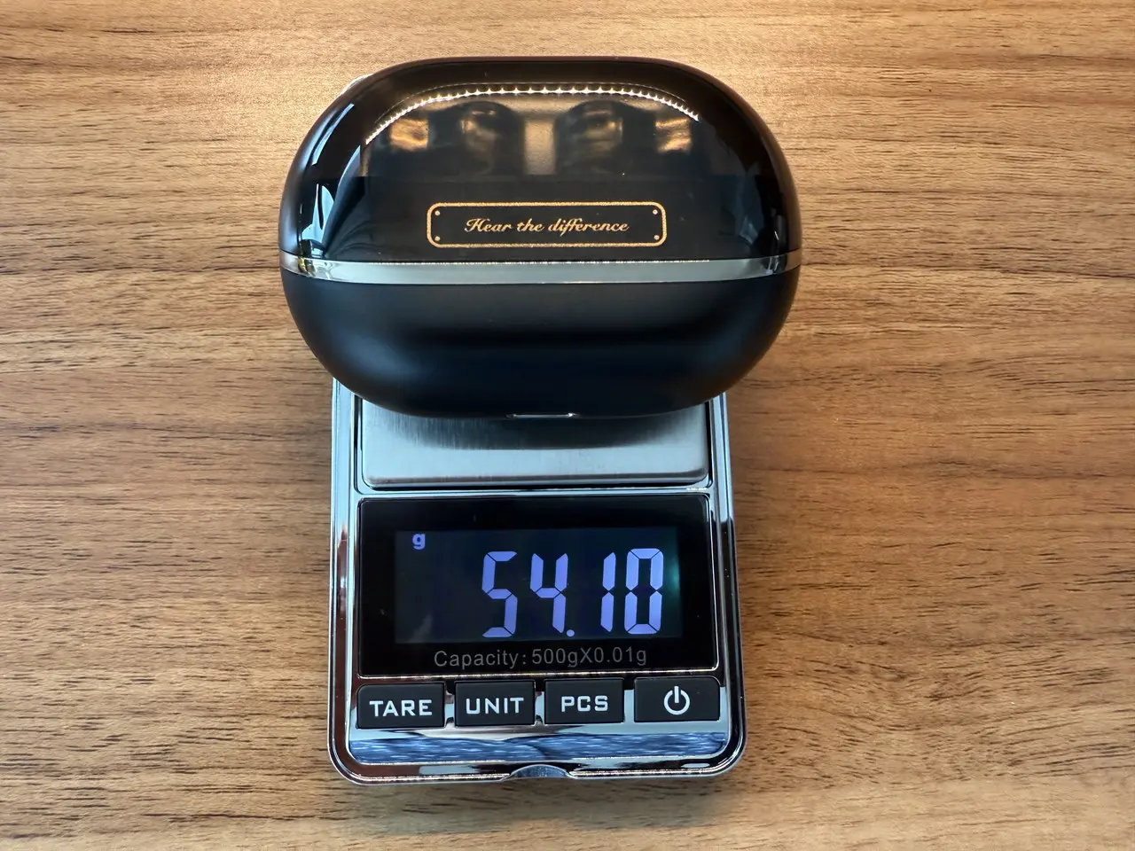 ▼ケース&イヤホン込みの総重量は、実測で約54.10g。