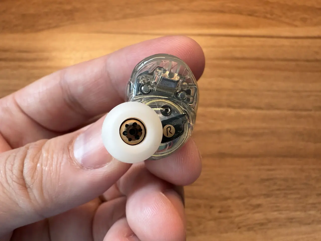 ▼イヤーチップを外した様子。イヤホン開口部(ノズル)の形状は一般的な円形のため、幅広いイヤーチップとの互換性を備えています。