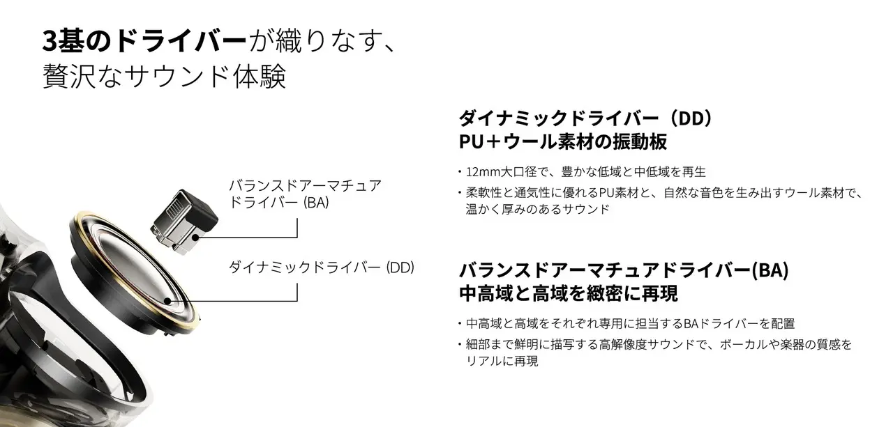12mmダイナミックドライバー(PU+ウール素材)×1、バランスド・アーマチュアドライバー×2 の計3基のドライバーを内蔵しており、低音から高音まで、贅沢なサウンド体験を提供します。