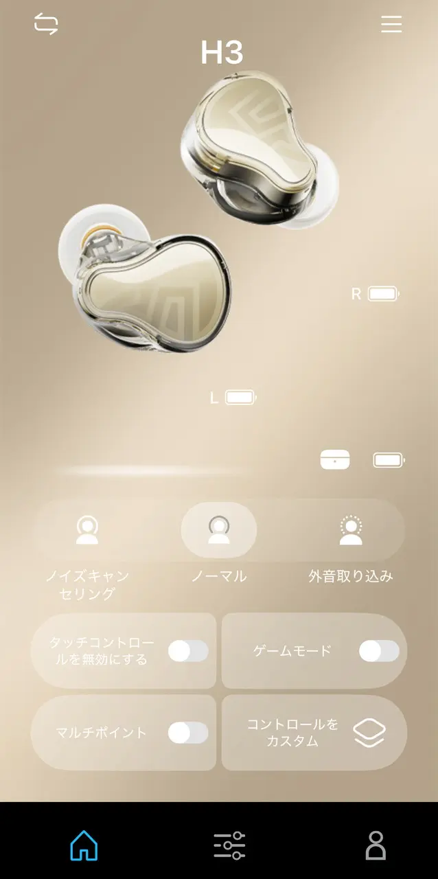 ▼アプリのメイン画面。イヤホンの充電残量や接続状態、音質に関する各種パラメータの調節などを行うことが可能。