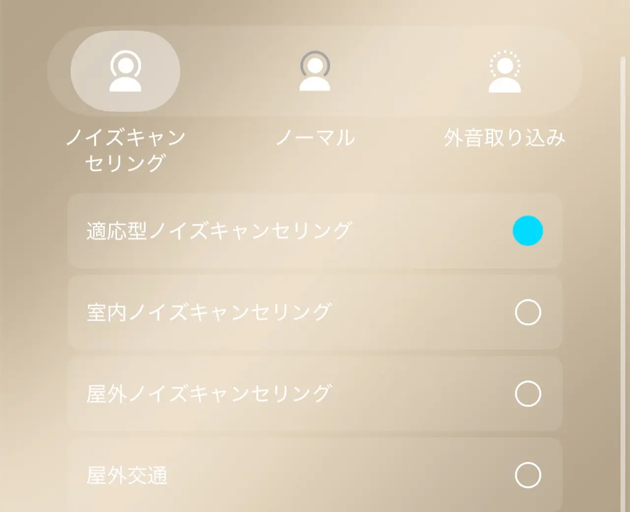 ノイズキャンセリングモードは「適応型ノイズキャンセリング」「室内ノイズキャンセリング」「屋外ノイズキャンセリング」「屋外交通」の4種類から選択可能。