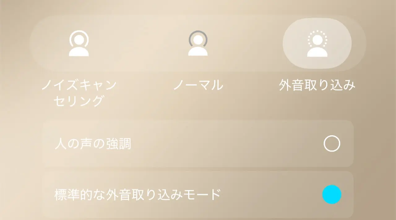 逆に、イヤホンを装着しつつ外部の音にも気を配りたい時のために、外音取り込み機能も用意されています。