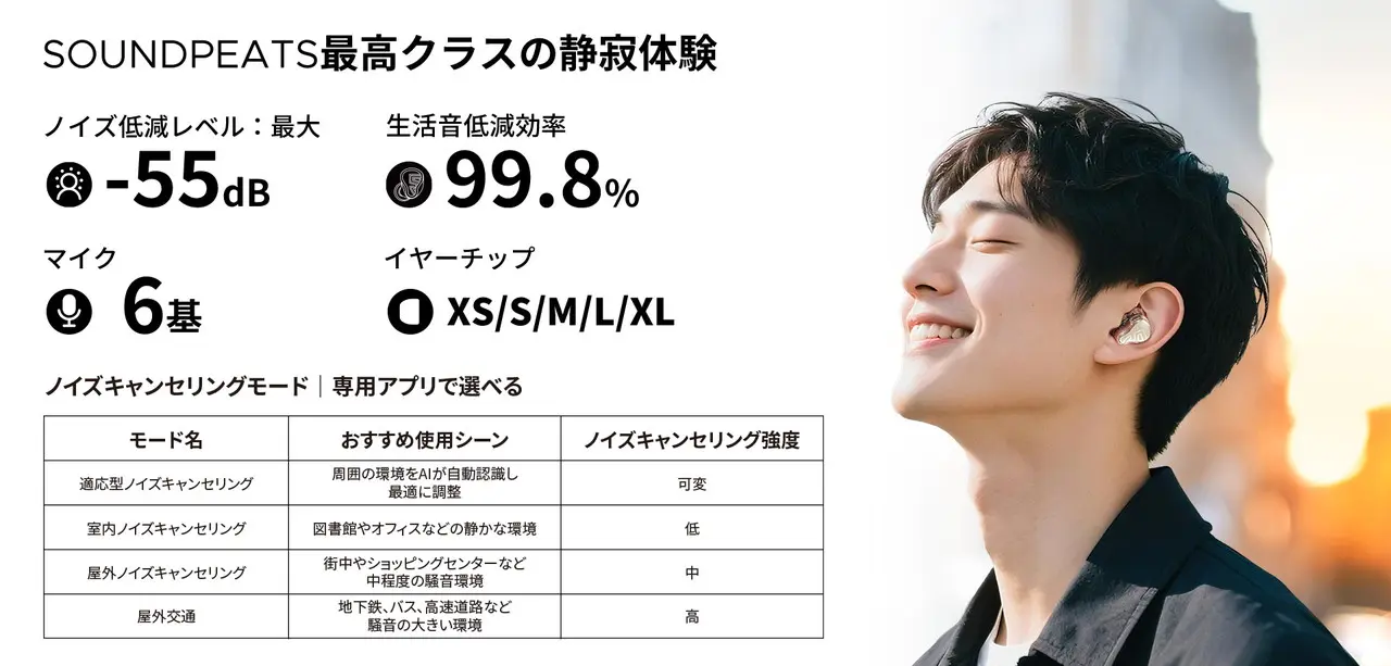 本製品は最大55dBの騒音を低減できるハイブリッド式アクティブノイズキャンセリングを搭載しており、SOUNDPEATS史上最高クラスの静音性を謳っています。