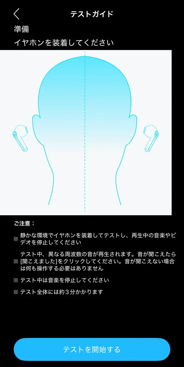 そして「アダプティブイコライザー」機能も用意。これは、ユーザーの聴覚特性や装着状態に応じて音質を最適化するテスト機能です。