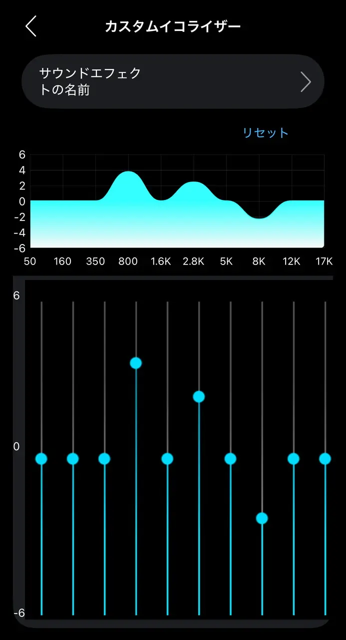 アプリトップ画面から「イコライザー」をタップすることで、イコライザー(EQ)のカスタマイズ画面が表示されます。