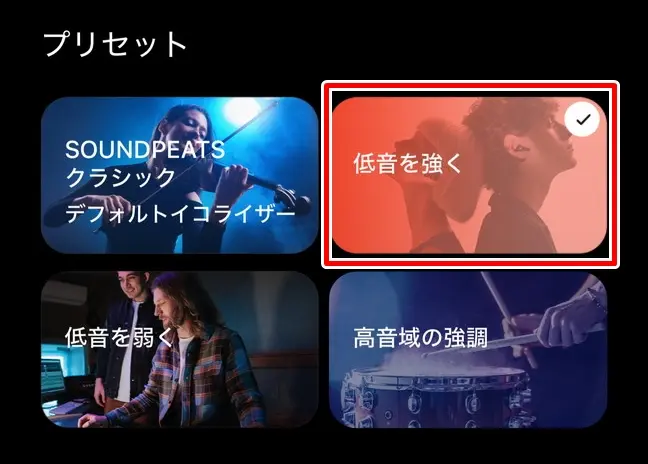 アプリ上では、複数のイコライザープリセットを利用できます。