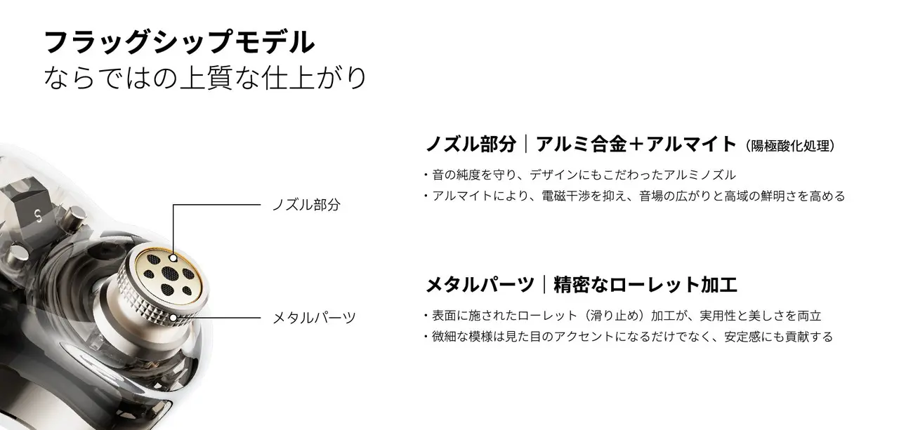 ▼イヤホン内部のノズル部分にはアルミ合金+アルマイトを、メタルパーツには精密なローレット加工が施されており、音の純度を守りつつ、デザインにもこだわっています。フラグシップモデルならではの上質な仕上がりです。