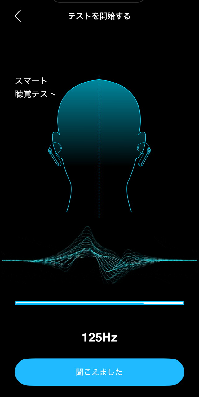 そして「アダプティブイコライザー」機能も用意されている。これは、ユーザーの聴覚特性や装着状態に応じて音質を最適化するテスト機能だ。