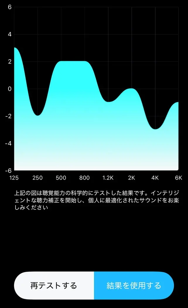特定の周波数のテストトーンやホワイトノイズをイヤホンから再生していき、テスト終了後にテストレポートを生成。その結果に基づいたイコライザー設定を反映できる。