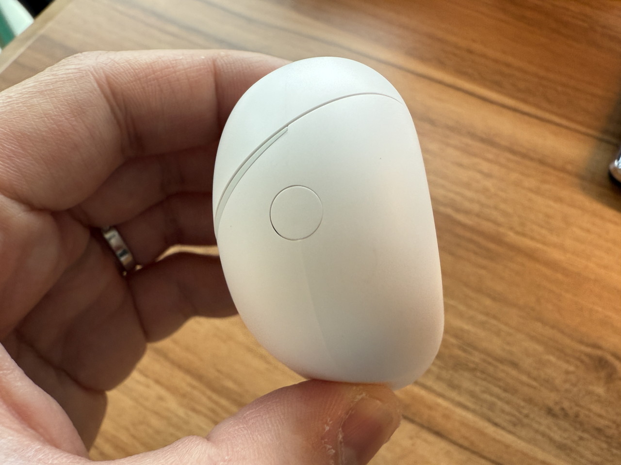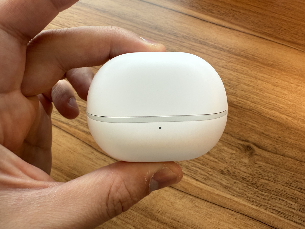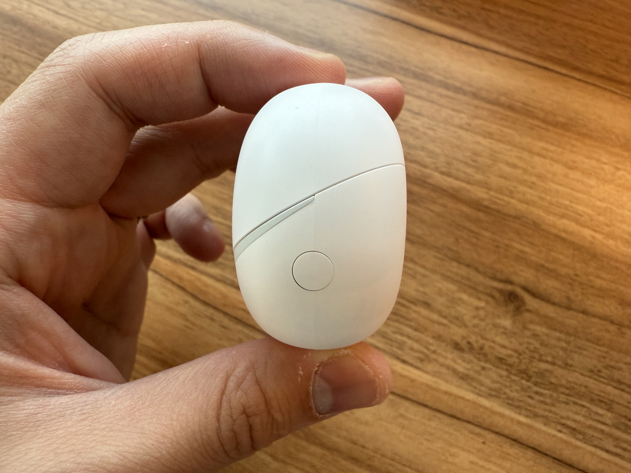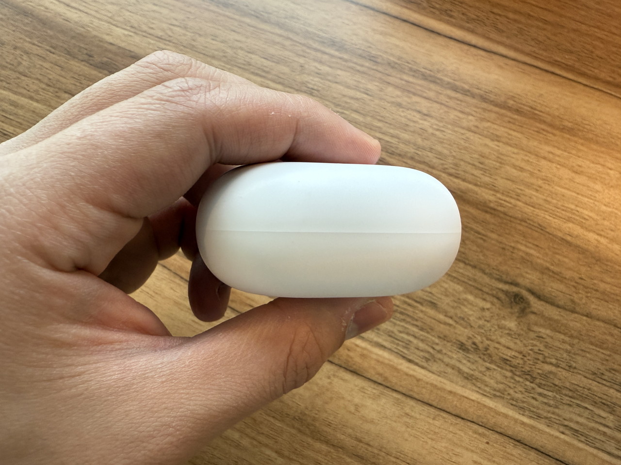 ▼チャージケースの外観。63.7×49.8×30.6mmの楕円形デザイン。