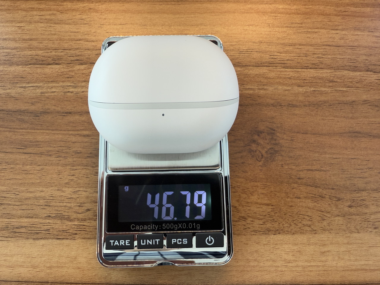 ▼イヤホンを格納した状態のケース重量は、実測で約46.79g。