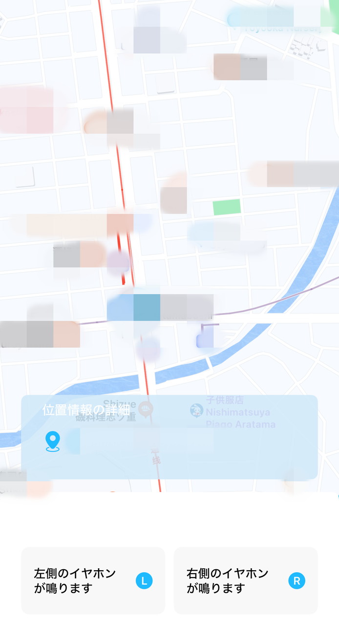 そして「○○側のイヤホンが鳴ります」をタップすることで、イヤホンから大音量の電子音を流し、近くに隠れているイヤホンを見つけ出すことができる。