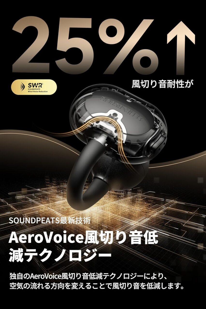 SOUNDPEATS最新技術として「AeroVoice風切り音低減テクノロジー」が搭載されており、空気の流れを変えることで風切り音を低減する。