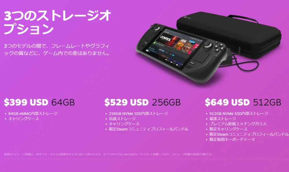 予約できるモデルは3種類あり、あまり外で遊ばない方は64GBモデルを買ったり、外で頻繁にゲームで遊ぶ方は512GBを購入するなどプレイスタイルに応じて選ぶことができます。
