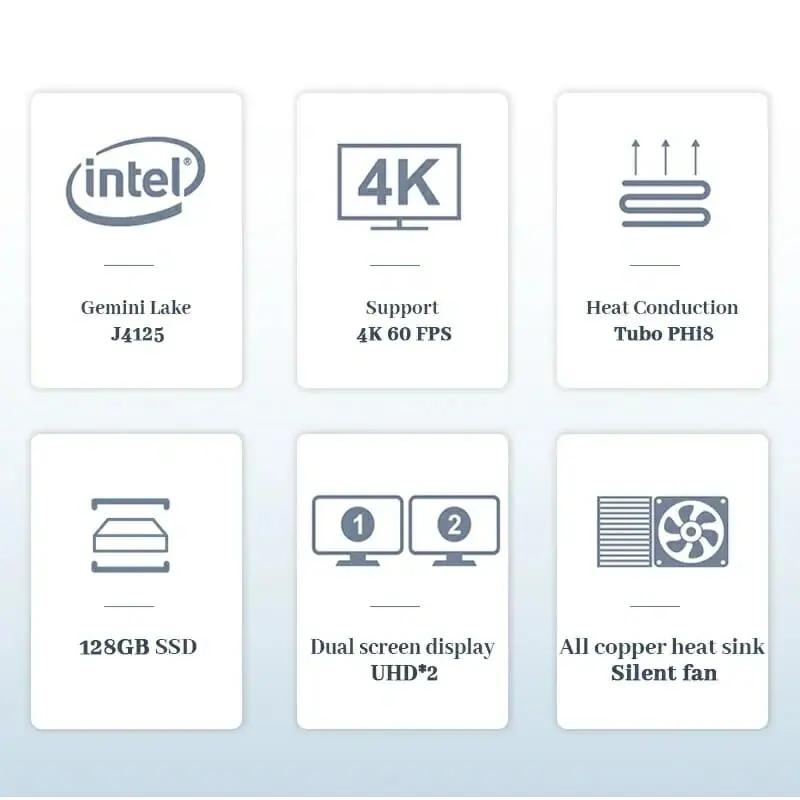 | CPU | Intel® Gemini Lake Refresh Processor J4125 (4C/4T, 4M Cache, 2.0GHz up to 2.7GHz) |