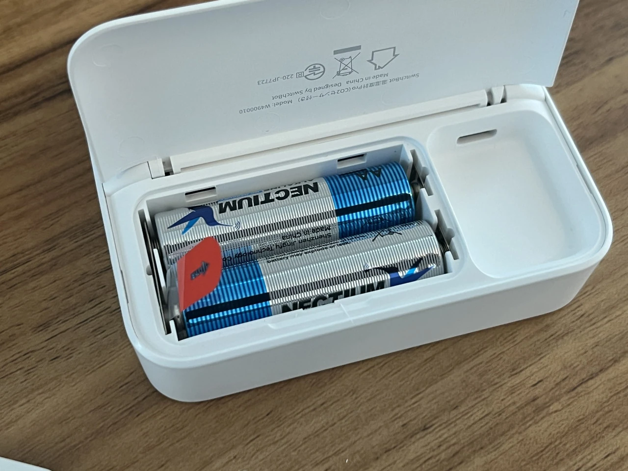 ▼さらに下のフタを取り外すと、電池投入部が現れる。購入時点ですでに単四電池×2が入っており、保護フィルムを取り外すことでCo2濃度計が稼働し始める。