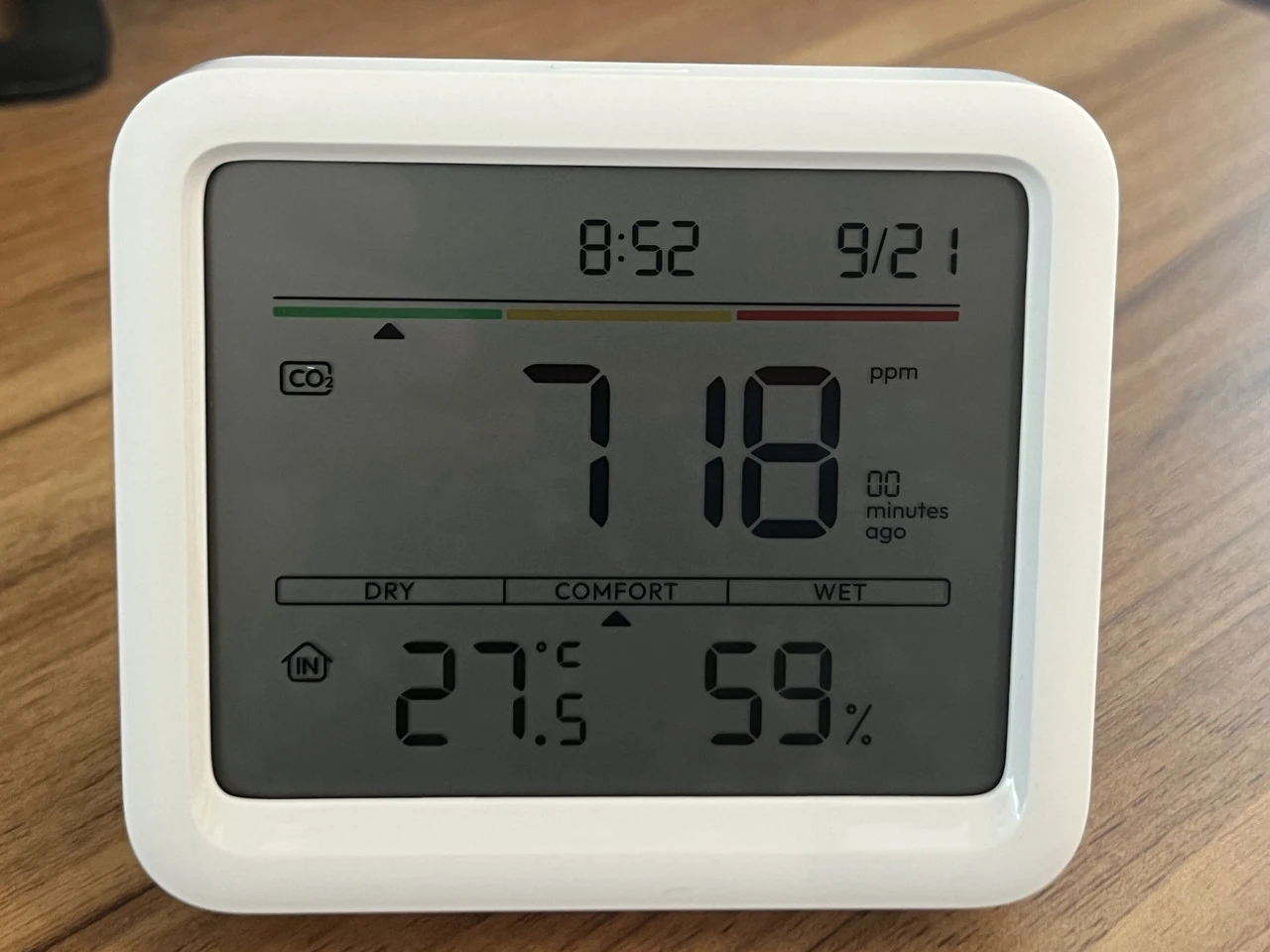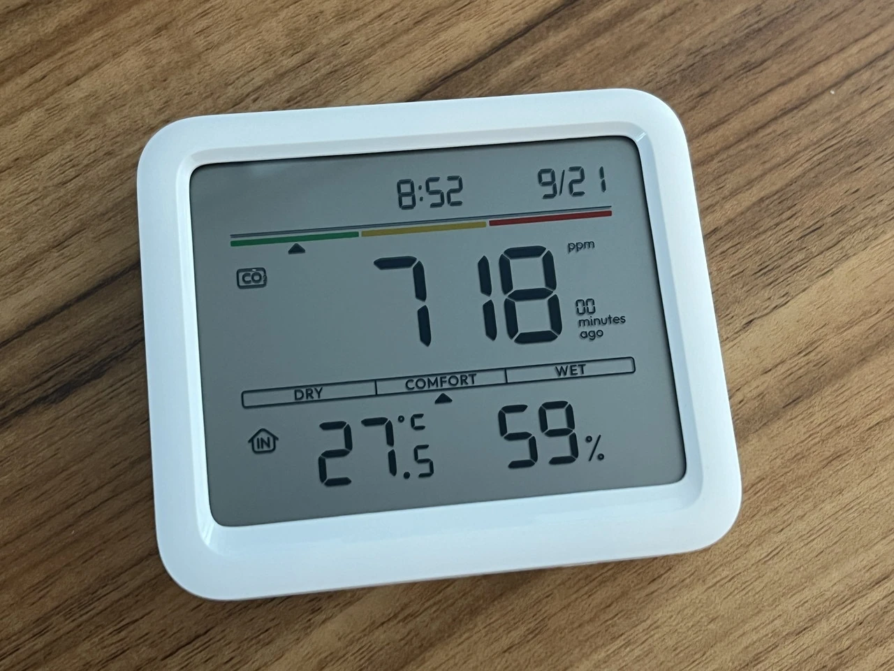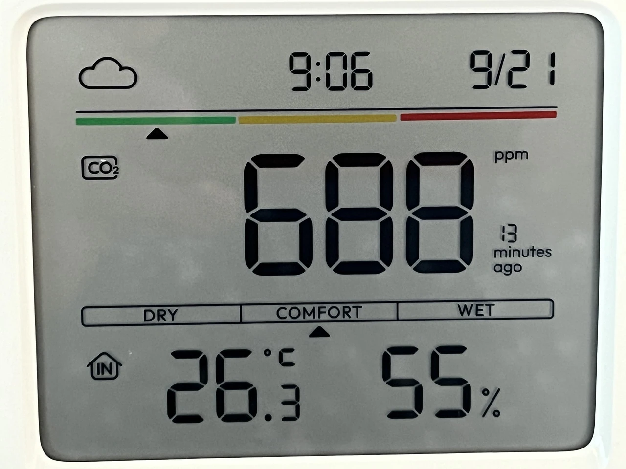 電源を入れた瞬間から測定が開始され、ディスプレイに現在の室内温度・湿度・CO2濃度・時間・日付などの情報が表示される。