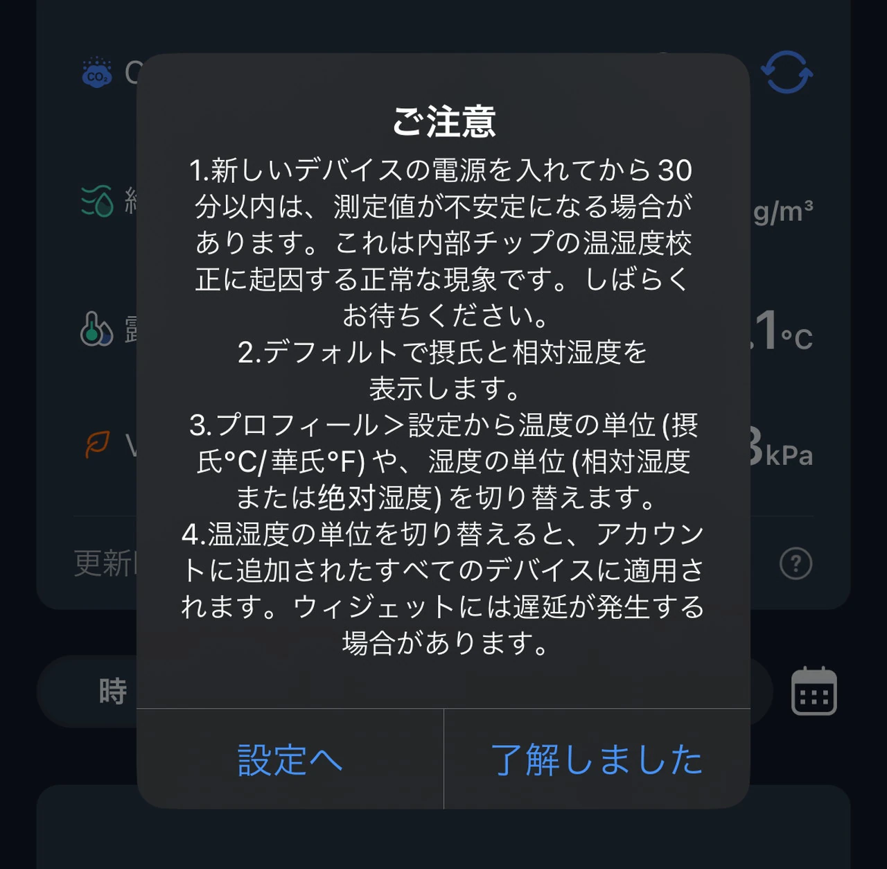 初期設定を進めると注意事項が表示される。初めて起動するデバイスの場合、電源を入れてから30分程度は測定値が不安定になる場合があるため、しばらく放置して安定させよう。