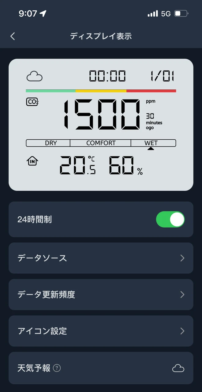 以上の通り、Co2濃度、温湿度、天気予報などすべてを表示できる、非常に充実した機能を備えたCo2濃度計となっている。