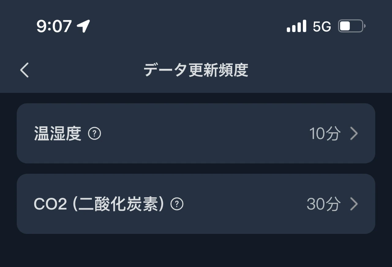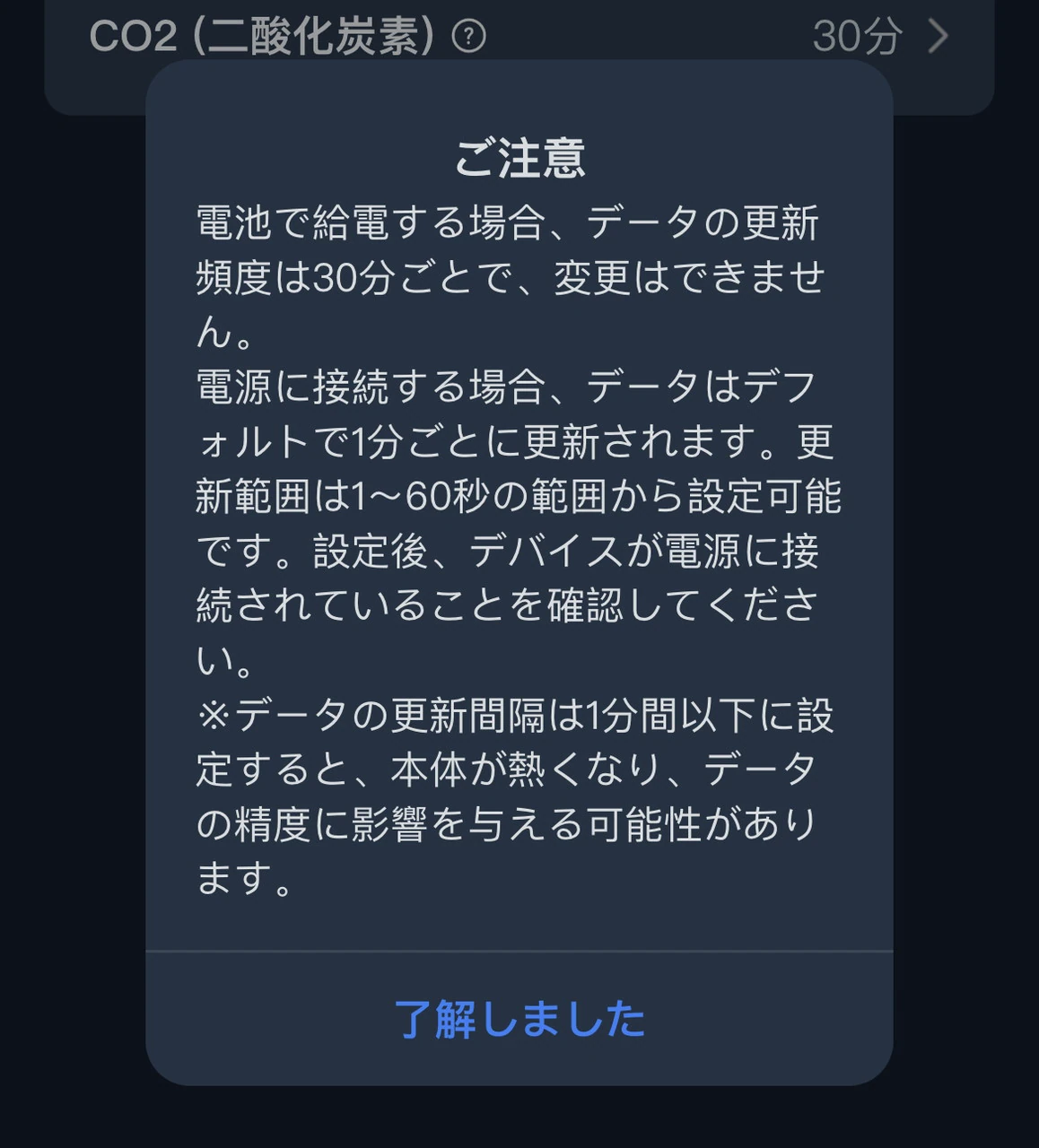 単三電池で稼働させている場合、CO2濃度のデータ更新頻度は30分で固定となっている。