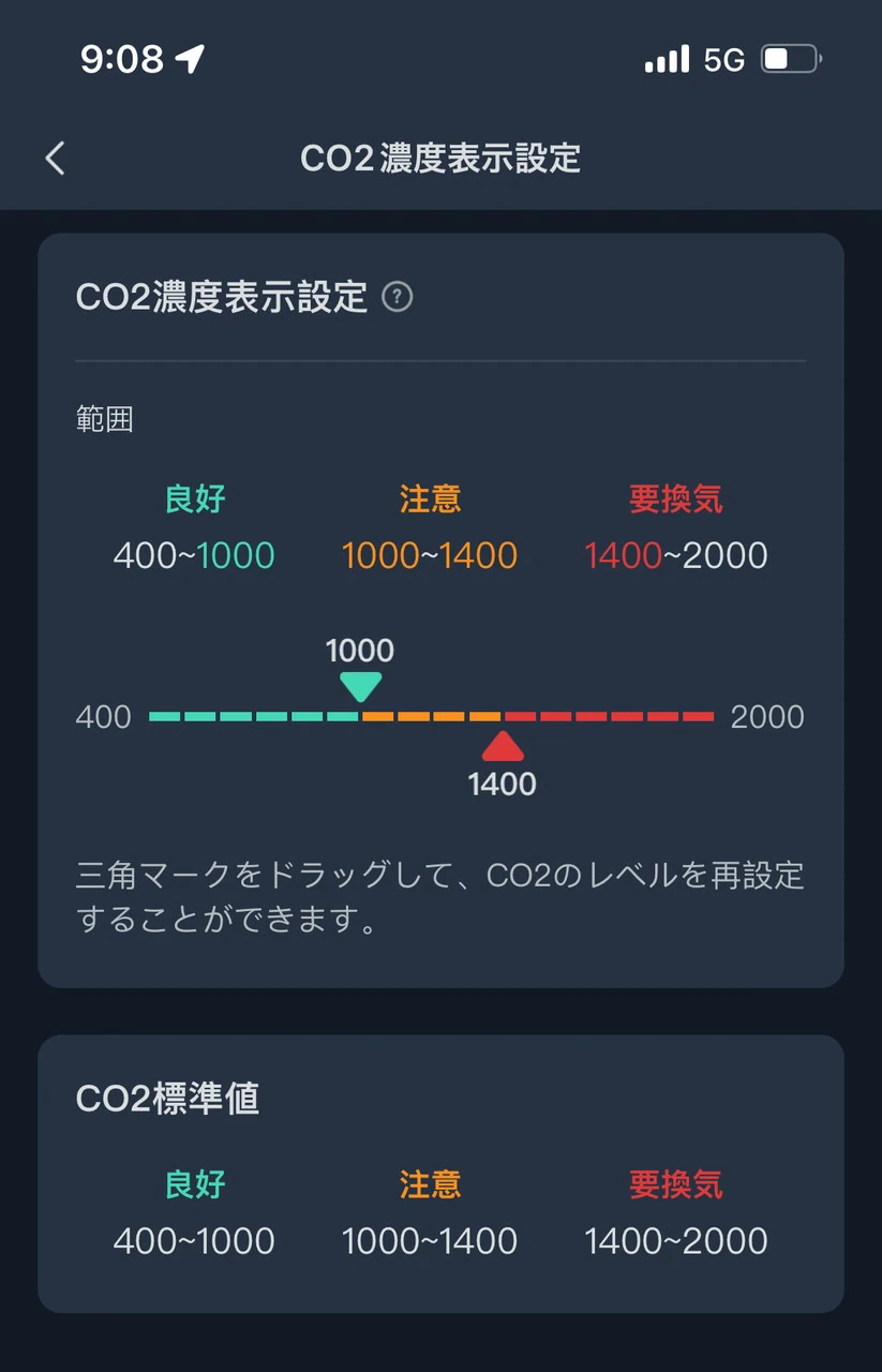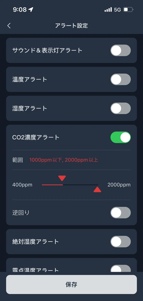 ▼項目ごとにアラートを設定可能。ここでも、CO2濃度アラートの基準範囲を調節できる。