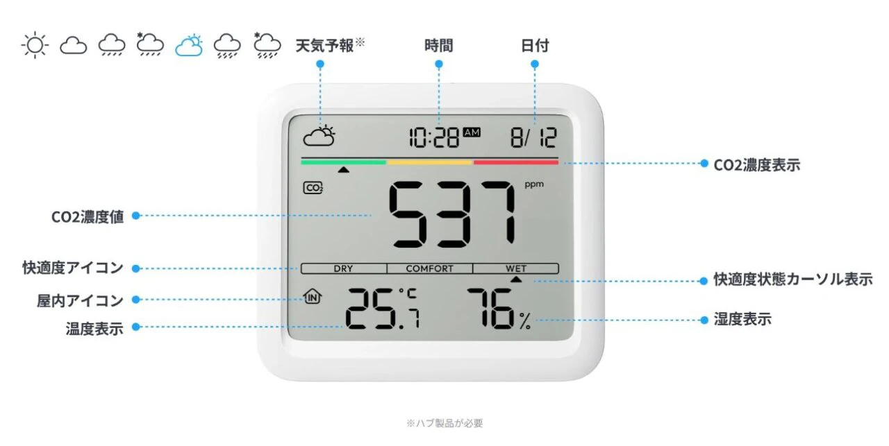 - Co2濃度、温湿度、天気予報などすべてを表示可能