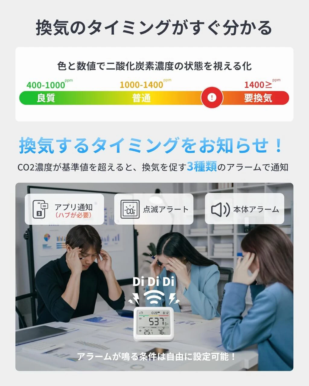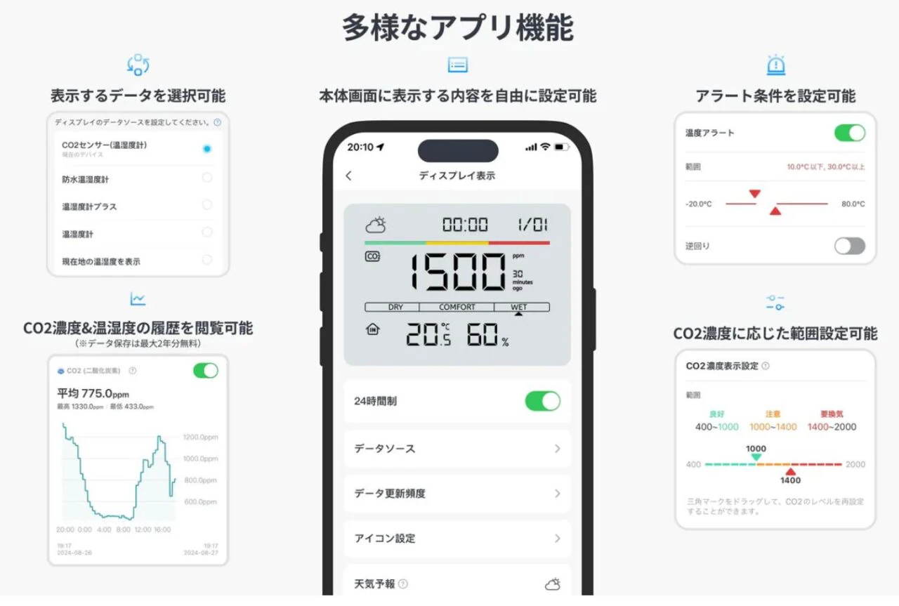 また、CO2濃度の変化に伴い、スマートフォンへ注意喚起を通知する機能も搭載されている。