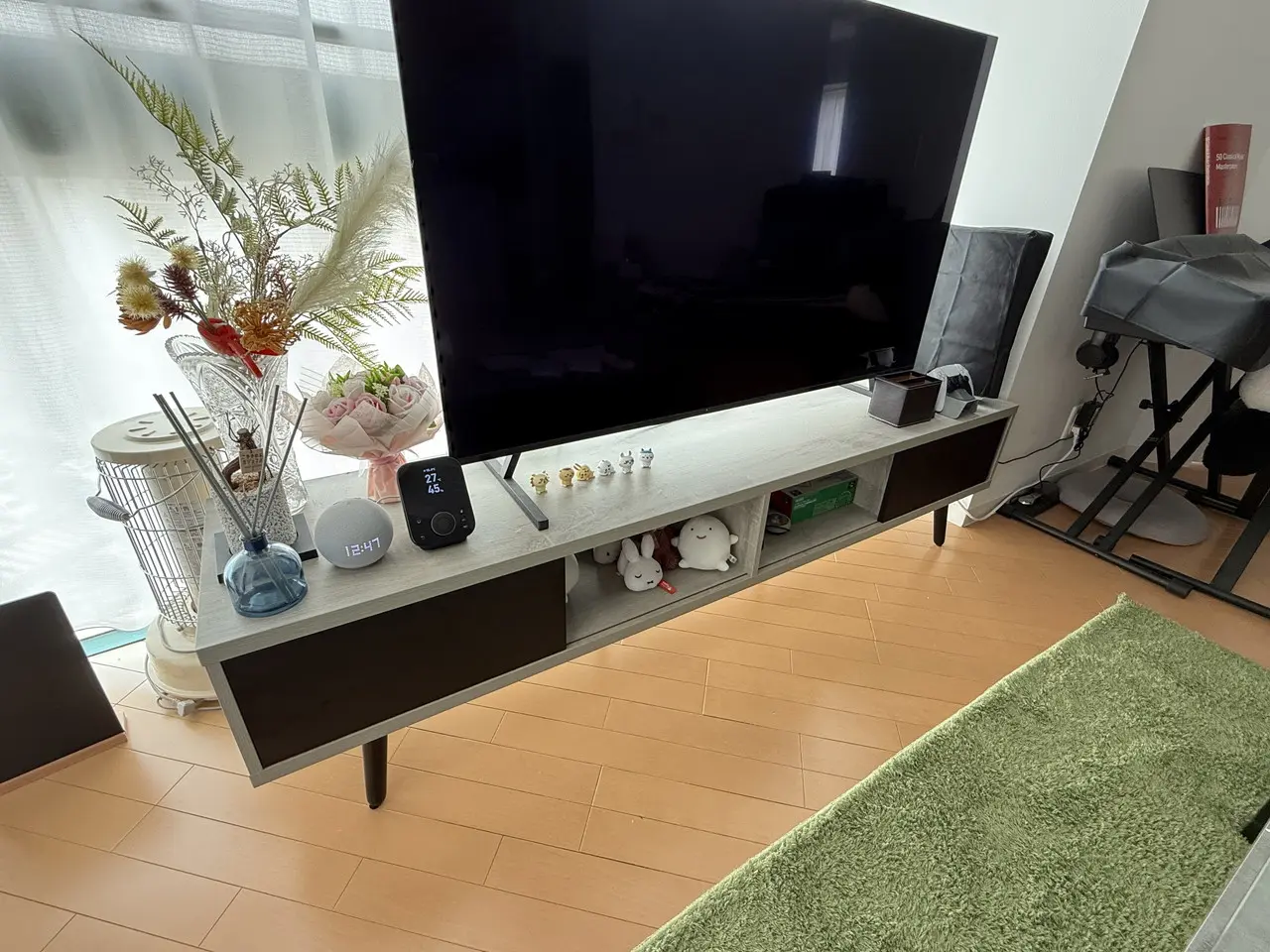 ▼今回のレビュー時には、テレビ台の上(アレクサの横)に設置してみた。