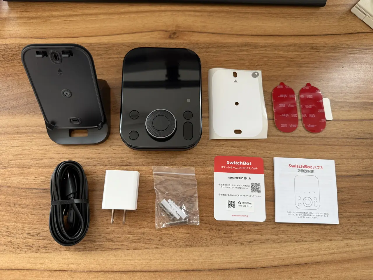 | 梱包内容 | ・ハブ3本体×1 ・5V/2Aアダプター×1 ・ネジパック×1 ・台座×1 ・スタンド×1 ・スタンド用両面テープ×2 ・温湿度センサー搭載ケーブル×1 ・温湿度センサー両面テープ×1 ・取付ステッカー×1 |
