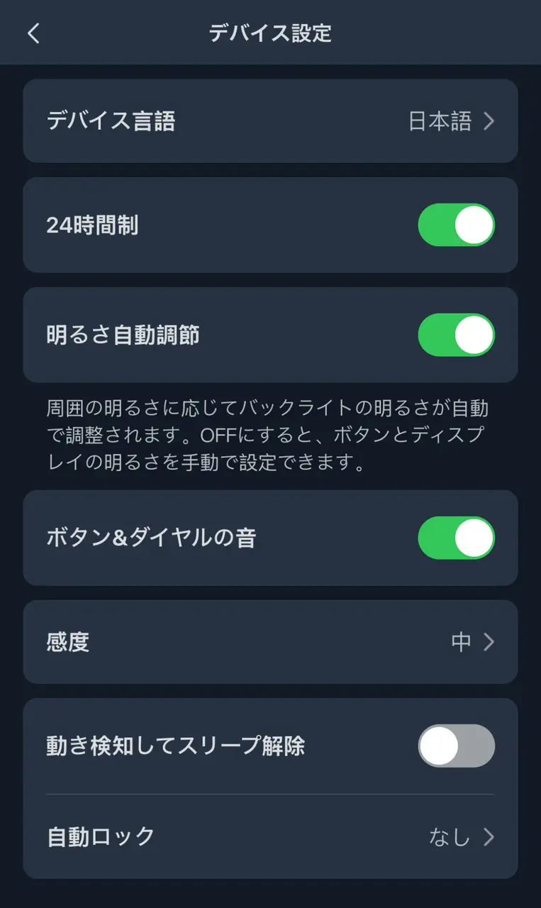 デバイス言語や時刻表示形式、明るさ、ボタン&ダイヤルの音など、ハブ3に関する基本的なパラメータを変更できる。