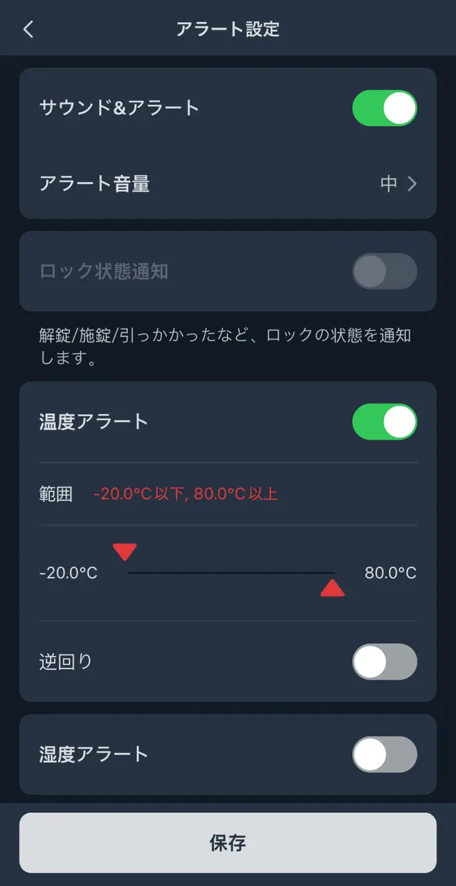 ハブ3のセンサーが検知した値が、事前に設定した範囲を逸脱した場合に、アラートを発するように設定できる。