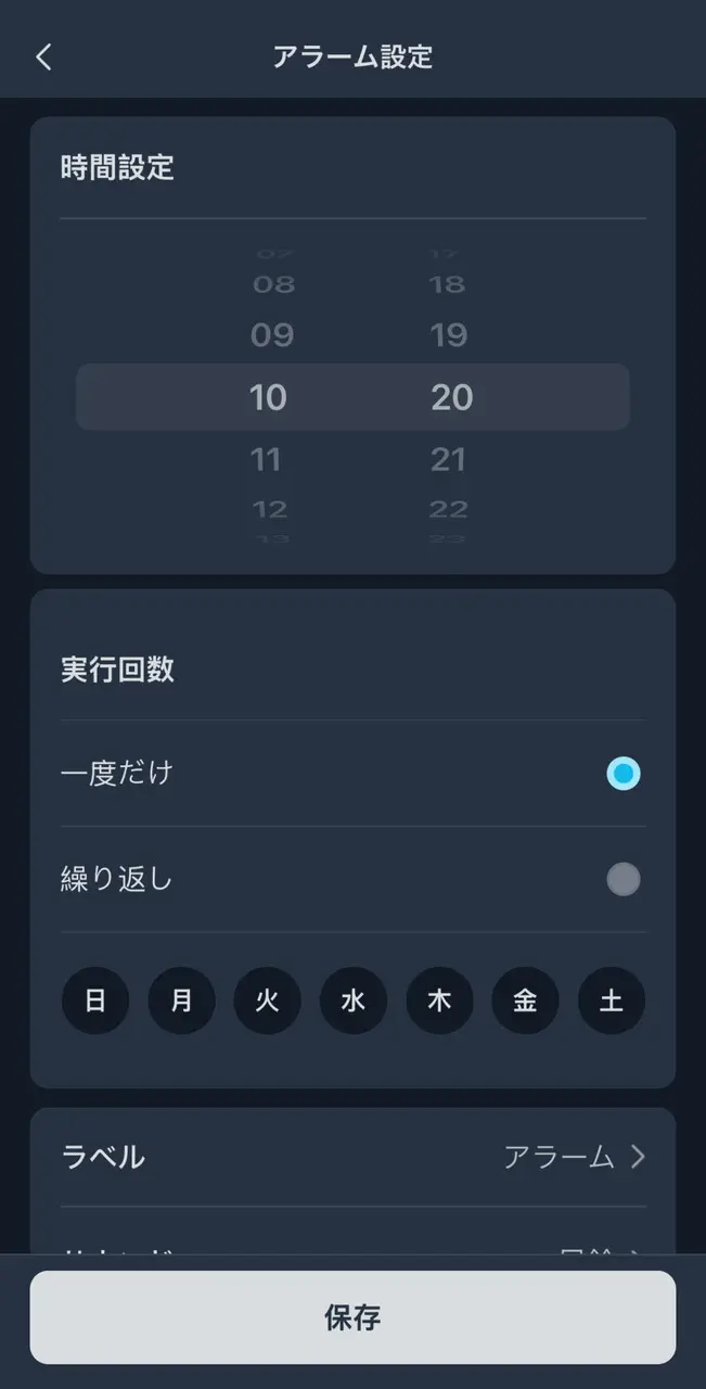 スマホのように、一般的なアラームを設定できる。目覚まし時計代わりや、日常のイベントのリマインダーとしても活用できる。