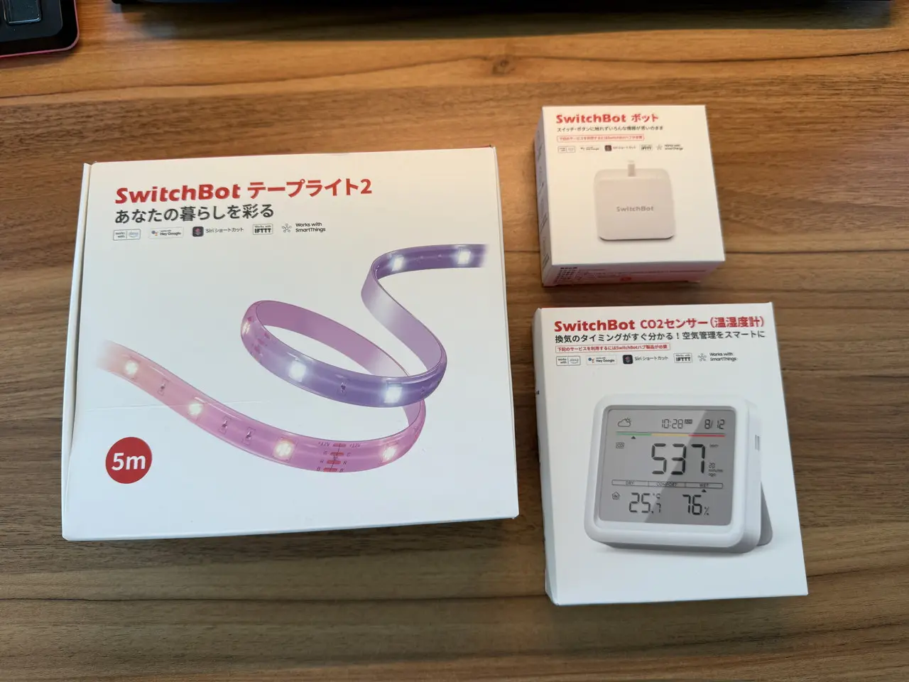 今回、ハブ3の機能を確認するにあたり、自宅に「SwitchBot CO2センサー」「SwitchBot テープライト2」「SwitchBot ボット」を設置して、ハブ3と連携させてみた。