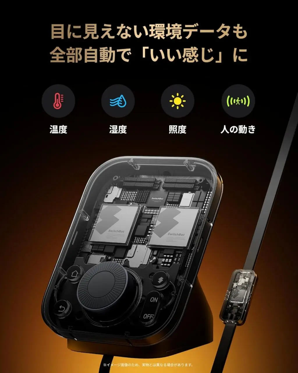 「温度」「湿度」「光」「人感」の計4つのセンサーを内蔵し、部屋の状況をリアルタイムで把握しつつ、 自動で家電をON/OFFして快適&省エネを実現できる。