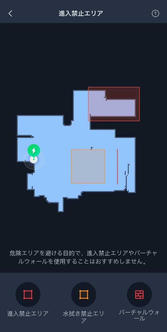 ▼ロボットに立ち入れられたくない場所を設定。仮想壁(バーチャルウォール)の指定も可能。